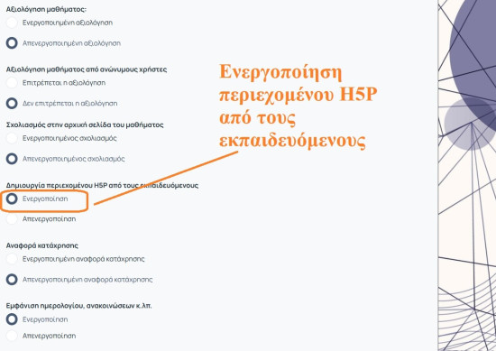 Μια νέα δυνατότητα η οποία δίνεται στους εκπαιδευόμενους μέσα από τις ρυθμίσεις του μαθήματος είναι η ενεργοποίηση δημιουργίας περιεχομένου H5P όπως αυτό παρουσιάζεται στην παρακάτω εικόνα.