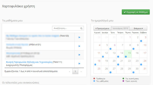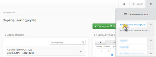 Επιλέγοντας το συγκριμένο υπο-μενού έχετε την δυνατότητα να προβάλετε τα μαθήματα στα οποία είστε εγγεγραμμένος και να μεταβείτε γρήγορα σε αυτά πατώντας απλά πάνω τους. Επίσης σε αυτό το μενού εκτός από τον τίτλο του μαθήματος παρουσιάζονται και τα ονόματα των υπευθύνων των μαθημάτων.