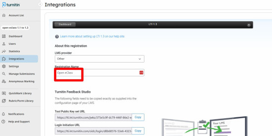 • Αντιγράψτε το πεδίο Tool Public Key set URL από το http://home.turnitin.com και επικολλήστε το στο πεδίο LTI Provider Public keyset στο Open eClass.