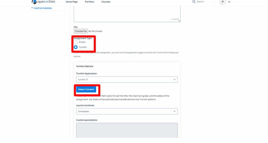 15. Στη συνέχεια, πρέπει να δημιουργήσετε το deployment για να συνδέσετε τον λογαριασμό Turnitin με το περιβάλλον του Open eClass. Για να το κάνετε αυτό, μεταβείτε σε ένα μάθημα και δημιουργήστε μια νέα εργασία. Στον Τύπο Εργασίας, επιλέξτε Turnitin. Ακολούθως κάντε κλικ στο Επιλογή Περιεχομένου (Select Content)