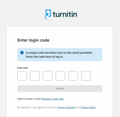 17. Ένας κωδικός σύνδεσης θα σταλεί στο email του διαχειριστή του Turnitin. Εισαγάγετε αυτόν τον κωδικό στα αντίστοιχα πεδία και, στη συνέχεια, κάντε κλικ στο Submit “Υποβολή”.