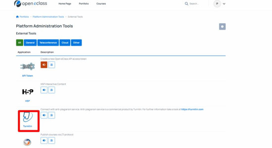 3. Βρείτε το Turnitin στη λίστα εξωτερικών εργαλείων και κάντε κλικ στο εικονίδιο του Turnitin.