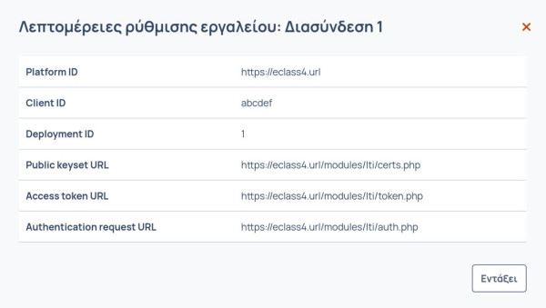 21. Πληροφορίες για τη διασύνδεσή σας θα εμφανιστούν σε ένα αναδυόμενο παράθυρο στην οθόνη σας. Όπως μεταφέρατε πληροφορία από το turnitin.com στο Open eClass, με τον ίδιο τρόπο τώρα θα χρειαστεί να μεταφέρετε πληροφορία από το Open eClass στο Turnitin tab που θα πρέπει ακόμα να έχετε ανοικτό. Συμπληρώστε τα παρακάτω πεδία στο Turnitin: Platform ID, Client ID, Public Keyset URL, Access Token URL, και Authentication Request URL.