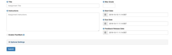 12. Τα πεδία Τίτλος, Προσαρμοσμένες παράμετροι, Μέγιστη βαθμολογία, Ημερομηνία Έναρξης, Προθεσμία, Προθεσμία αποτελεσμάτων θα μεταφερθούν αυτόματα στο Open eClass από το Turnitin και κάποια από αυτά θα μαρκαριστούν ως μόνο για ανάγνωση για βοηθήσουν την ενημέρωσή τους μόνο στο περιβάλλον του Turnitin. Επιλέξτε Υποβολή για να δημιουργήσετε την εργασία και να επιστρέψετε στη λίστα εργασιών του μαθήματος.