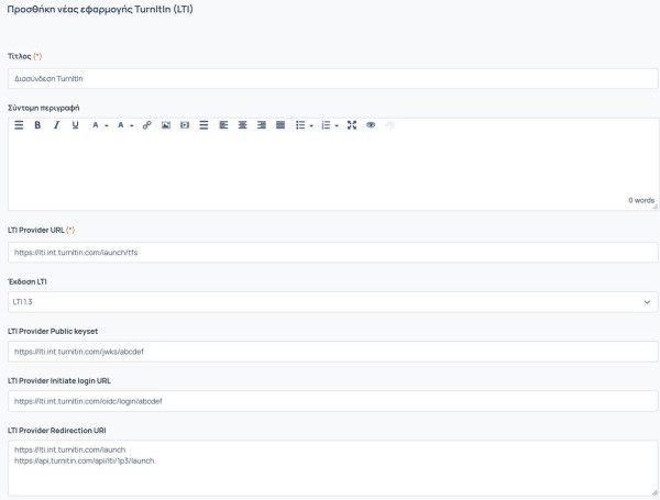 12. Στη συνέχεια, αντιγράψτε το πεδίο Tool URL από το turnitin.com στο LTI Provider URL πεδίο στο Open eClass. Η συμπλήρωση της Σύντομης περιγραφής είναι προαιρετική.