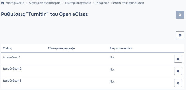 19. Η διασύνδεσή σας τώρα θα εμφανίζεται στην ενότητα Turnitin των ρυθμίσεων των Εξωτερικών εργαλείων. Τώρα θα πρέπει να μεταφέρετε κάποιες ρυθμίσεις από το Open eClass στο Turnitin ώστε να γίνει η ενεργοποίηση στη μεριά του Turnitin.