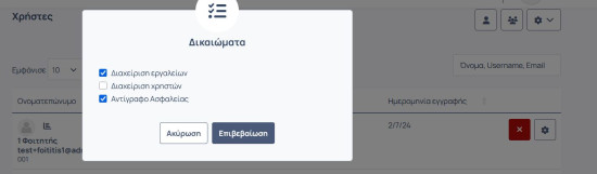 Για να διαγράψετε πολλούς χρήστες, στο εικονίδιο “γρανάζι” επιλέξτε “Διαγραφή χρηστών” και στην οθόνη που εμφανίζεται επιλέξτε τα κατάλληλα κριτήρια διαγραφής. Επιλέξτε “Εκτέλεση ενεργειών” για να ολοκληρώσετε τη διαγραφή ή “Επιστροφή” για να την ακυρώσετε.