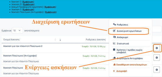 Το παρόν εγχειρίδιο περιγράφει την τεχνική διαδικασία αυτόματης παραγωγής ερωτήσεων στο Open eClass (v4.2+) μέσω του ενσωματωμένου AI Engine. Ως εκπαιδευτής του μαθήματος θα πρέπει να επιλέξετε το υποσύστημα «Ασκήσεις» εν συνεχεία επιλέξτε την άσκηση που επιθυμείτε και ακολούθως τις ενέργειες των ασκήσεων (εικονίδιο γρανάζι). Συνεχίζοντας στο αναδυόμενο μενού επιλέξτε “Διαχείριση ερωτήσεων''.
