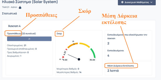 Η οθόνη των στατιστικών αποτελεί το βασικό εργαλείο του εκπαιδευτή για την αξιολόγηση της άσκησης. Στο πάνω μέρος της σελίδας εμφανίζονται τα συγκεντρωτικά στοιχεία συμμετοχής, όπου καταγράφονται οι Προσπάθειες (συνολικός αριθμός υποβολών) και ο αριθμός των Εκπαιδευομένων που ολοκλήρωσαν την άσκηση. Η σύγκριση αυτών των δύο μεγεθών επιτρέπει στον εκπαιδευτή να κατανοήσει αν οι χρήστες χρειάστηκαν επαναλήψεις για να επιτύχουν το επιθυμητό αποτέλεσμα. Παράλληλα, η Μέση Διάρκεια Εκτέλεσης δίνει μια σαφή ένδειξη για τον χρόνο που αφιέρωσαν κατά μέσο όρο οι εκπαιδευόμενοι στην άσκηση.
