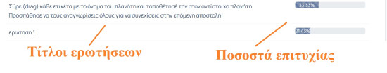 Στην ενότητα της βαθμολογίας (Σκορ), παρουσιάζεται το εύρος των επιδόσεων μέσω του Μικρότερου και του Μεγαλύτερου Βαθμού. Τα στοιχεία αυτά βοηθούν στον άμεσο εντοπισμό της χαμηλότερης και της κορυφαίας επίδοσης στο σύνολο της τάξης. Τέλος, ο πίνακας Ερωτήσεις προσφέρει λεπτομερή ανάλυση ανά θέμα. Για κάθε ερώτηση εμφανίζεται ο Τίτλος της και το Ποσοστό επιτυχίας. Το ποσοστό αυτό είναι ο σημαντικότερος δείκτης για τον εκπαιδευτή, καθώς υποδεικνύει ποια σημεία της ύλης έχουν κατανοηθεί πλήρως και ποιες ερωτήσεις παρουσίασαν υψηλό βαθμό δυσκολίας, επιτρέποντας στοχευμένες παρεμβάσεις στη διδασκαλία.