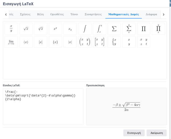 Μπορείτε στα σημεία που εμφανίζεται ο ενσωματωμένος συντάκτης κειμένου να εισάγετε μαθηματικά σύμβολα. Η εισαγωγή γίνεται με 2 τρόπους