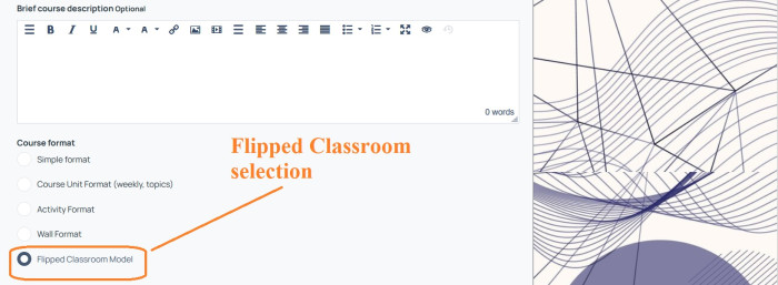To create a Course with the Flipped Classroom model enabled, we first select the “Create Course” link. Subsequently, we fill in the remaining fields (Category, Instructors, Short description, Course format in sections) and activate the “Flipped Classroom Model” by pressing the “Active” button. It should be emphasized here that the “Course in sections” format must be selected for the course's format for the activation of the “Flipped Classroom” model to be meaningful. Next, we fill in the course's access type (Open, Open with registration, Closed) and select the “Submit” link to complete the process.